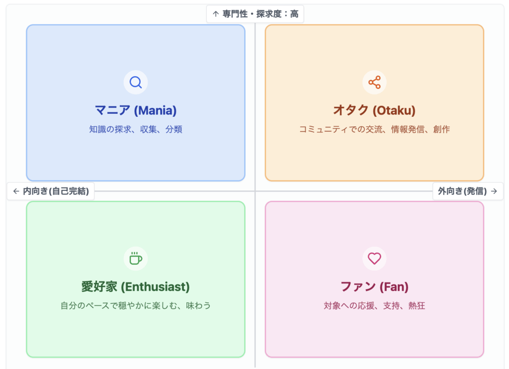 • 専門性: 「中〜高」。対象を深く楽しむために必要な知識は持っていますが、知識の網羅(マニア)や発信(オタク)が目的ではありません。