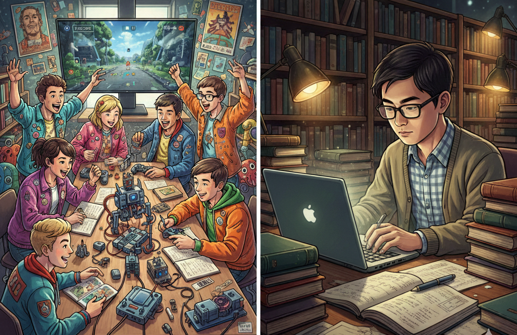 ナードの最も古典的な定義は、社会的なスキルに欠けているという点です。パーティーやスポーツ観戦といった「主流(メインストリーム)」の社交活動に関心が薄く、あるいは苦手意識を持ち、一人または少数の同好の士と過ごすことを好みます。会話の文脈を読まずに専門的な話を続けてしまうような「不器用さ」も、ナードの特徴とされてきました。 - 知的な没頭と専門性(Intellectual Obsession)