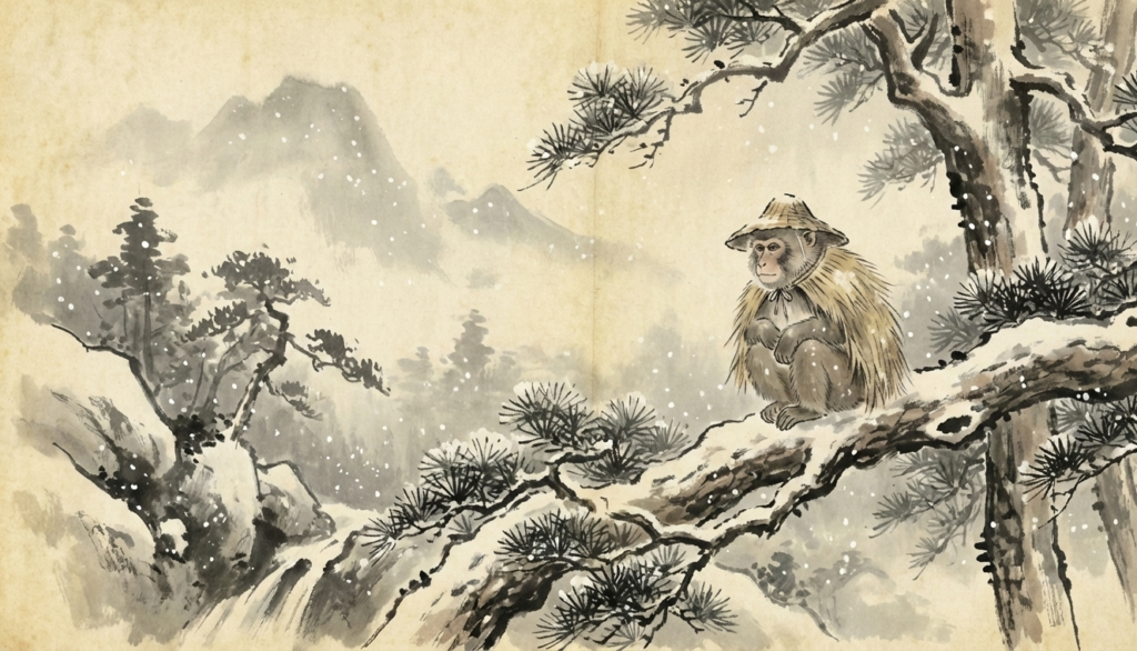 この句の面白さは、猿に自分自身の姿、あるいは人間全体の姿を重ね合わせている点にあります。冷たい雨に打たれる猿の姿に「侘び」や「寂び」を見出しつつ、同時に「蓑を貸してやりたい」という芭蕉の優しい眼差しが存在します。また、深読みすれば、「自分もあの猿と同じく、自然の中で寒さに耐えながら旅を続ける孤独な存在だ」という共感が込められているとも解釈できます。小学生には「お猿さんも寒くてカッパを欲しがっているね、かわいそうだね」という慈愛の句として読めますが、大人の鑑賞としては、自然の厳しさと一体化しようとする芭蕉の漂泊の精神、そして「わび」の美学の宣言を感じ取ることができるでしょう。
