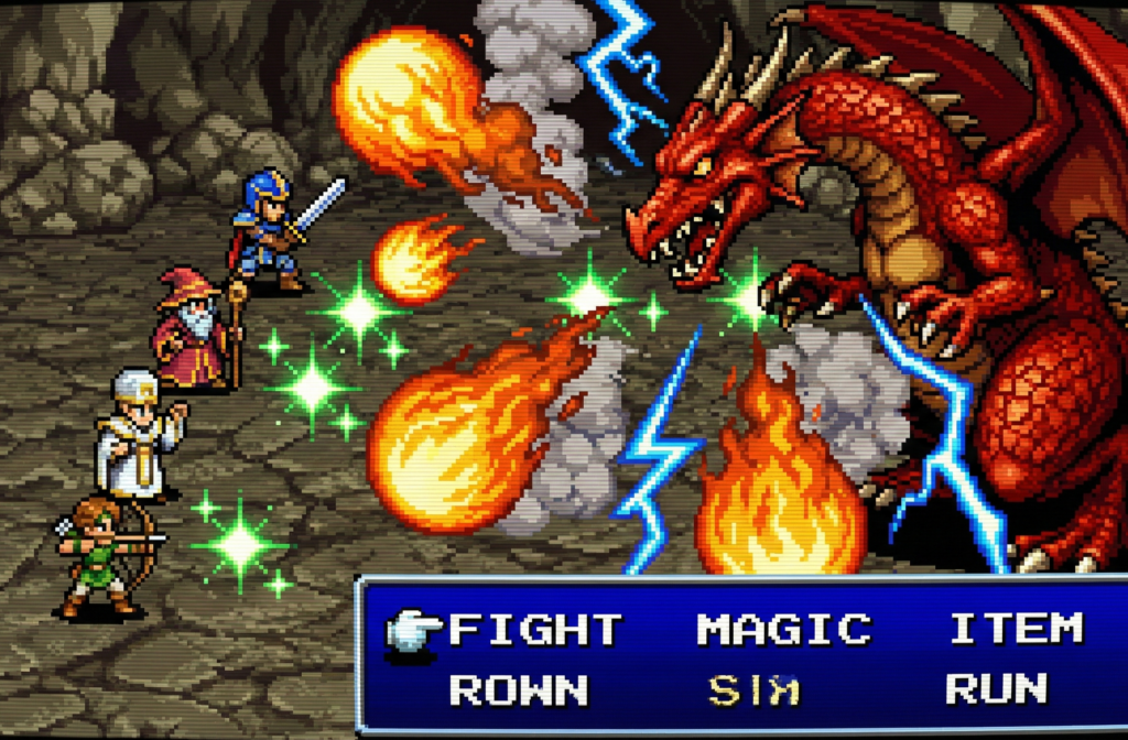 まずはここからでしょう。日本のRPGシーンを牽引し続けてきた「国民的ゲーム」。誰もがコントローラーを握りしめて唱えた、あの有名な魔法たちです。
