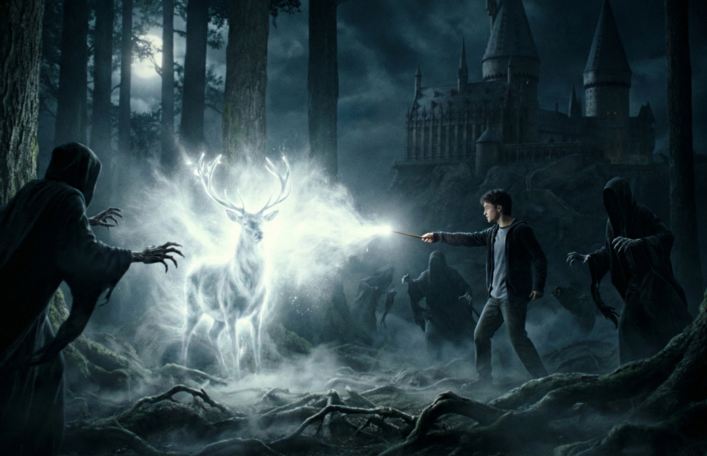 吸魂鬼(ディメンター)を追い払う守護霊を呼び出します。「幸福な記憶」を思い浮かべる必要があり、術者の精神力が試される高度な魔法です。