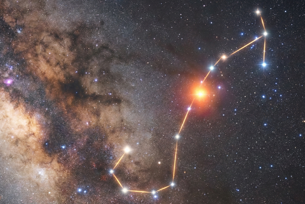 • 注目の星: アンタレス(1等星)。「火星(Ares)に対抗(Anti)するもの」という意味を持つ赤色超巨星です。その不気味なほどの赤さは、サソリの心臓として怪しく脈打っています。