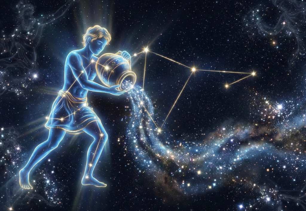 ガニメデはそこで永遠の若さを与えられ、神々の宴会でお酒(ネクタル)を注ぐ給仕係となりました。 みずがめ座が抱える瓶からは、こぼれ落ちた神聖な水が溢れ出し、下にある「みなみのうお座」の口へと注がれ続けています。