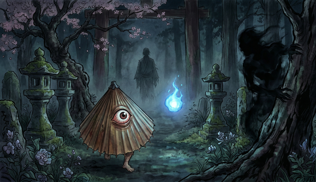 | 妖怪 | 現象が「具現化・キャラクター化」したもの | 特定の空間(山、川、境界線など) | 明確な造形と固有の名前を持つ | 河童、天狗、小豆洗い、ぬらりひょん |