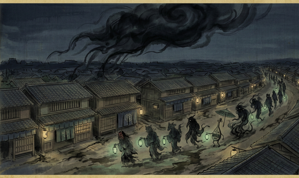 日本には昔から「すべてのものに魂が宿る」という考え方があります。長く生きたキツネやタヌキが霊力を得て人を化かしたり、百年以上使われた傘や提灯が「付喪神(つくもがみ)」として動き出したりするのがこれに当たります。少し滑稽で、日常のすぐ隣にいる不気味な存在として語り継がれてきました。