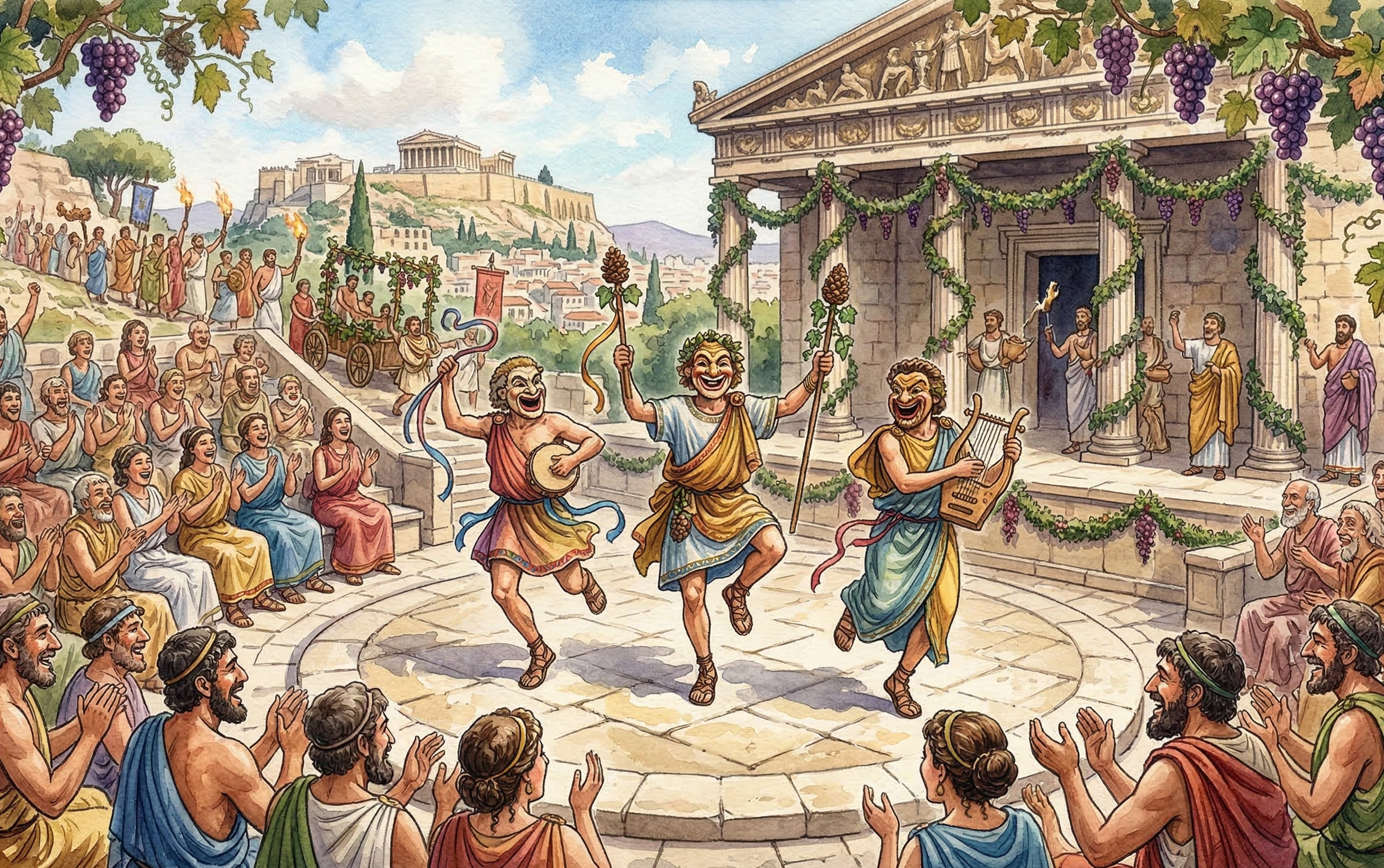 古代ギリシアでは、お酒と豊作の神様、ディオニュソスのお祭りがありました。その時、人々は仮面を被り、歌って踊ってパレードをしました。このエネルギッシュなお祭りが、やがて劇場で演じられるようになって、喜劇が生まれたと言われています。