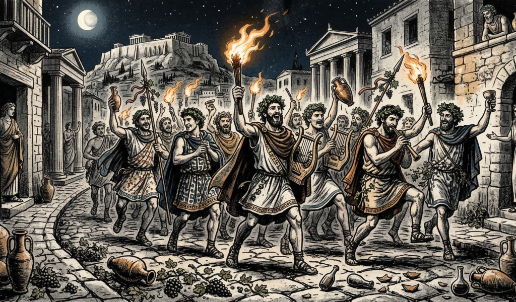 英語で「コメディ(Comedy)」と言いますが、そのルーツは、紀元前の古代ギリシアまで遡ります。語源は「コモイディア(kōmōidia)」という言葉。これは、「コモス(kōmos:酒宴、お祭り騒ぎ)」と「オイデ(oidē:歌)」が合わさったものです。