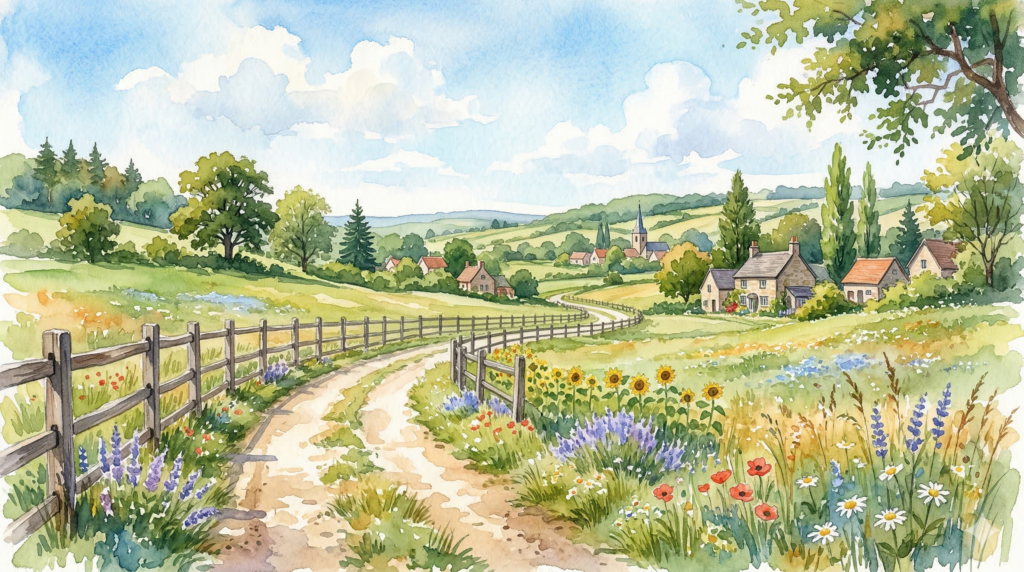 最もオーソドックスなのは、自然が豊かで平和な景色や、のんびりとした情景を表現する場合です。「のどかな田舎」と言うよりも、情緒的で詩的な表現になります。