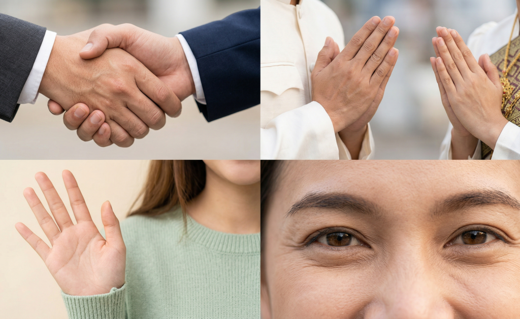 世界を見渡すと、相手との「パーソナルスペース(他人に近づかれると不快に感じる空間)」の捉え方によって、あいさつの際の身体的接触の度合いが大きく異なります。ここでは代表的な4つの非言語あいさつの違いとルールを解説します。