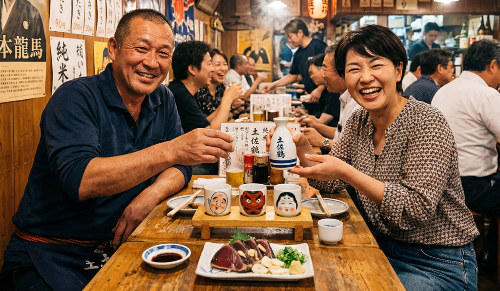 シーン3:ひろめ市場や居酒屋で美味しい店やメニューを教える時