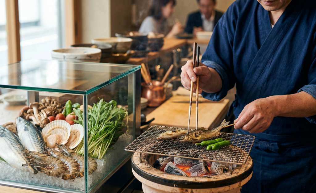 現在の割烹店の大きな特徴は、美しい白木のカウンターを挟んで客席と厨房が一体になった「オープンキッチン」スタイルです。目の前で板前さんが魚を捌き、手際よく野菜を切り、炭火で焼き上げる姿を楽しむことができます。