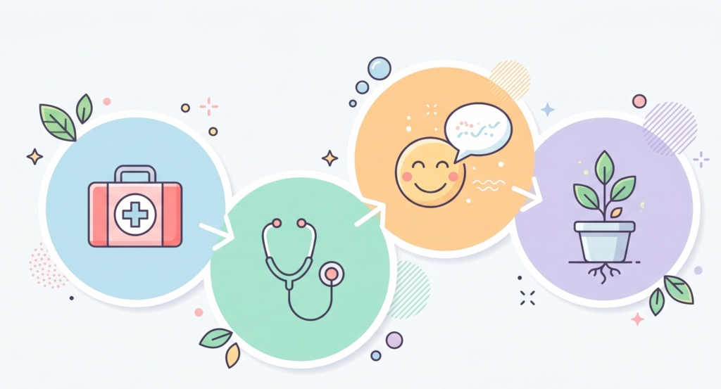 保健室の活動は、大きく4つの基本機能に分けられます。これらは、子どもたちの健康を「守り」、そして自ら健康を維持できる力を「育てる」ために設計されたものです。