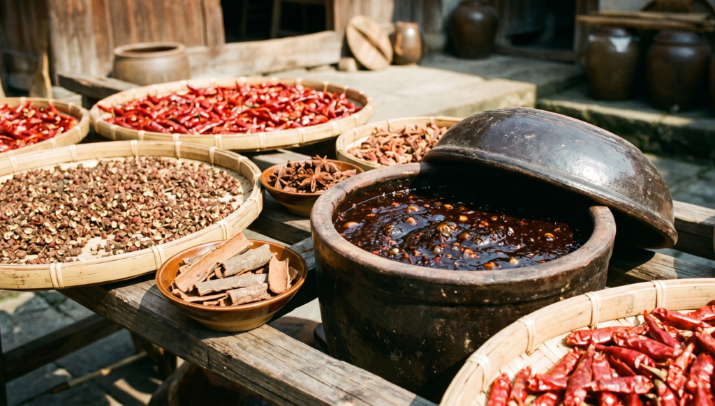 四川料理が持つ「百菜百味」のマジックは、厨房に並ぶ無数のスパイスと、太陽と風の力を借りて長期間熟成された発酵調味料の融合によって生み出されます。